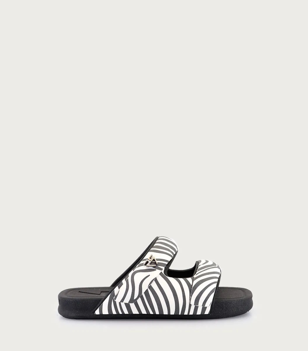 Plataforma Koru cebra, inyectada con estampa y herraje de logo. Un modelo que fusiona estilo y practicidad.