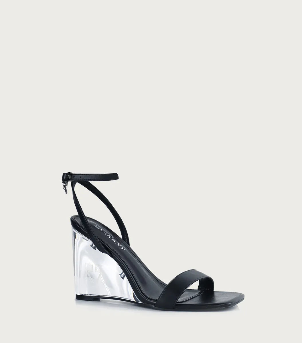 Sandalia Prata negro en fibras animal friendly, con hebilla con logo y forrería en fibras animal friendly. Taco acrílico con logo grabado a láser y suelín de goma para confort. Altura del taco: 9 cm. Una opción elegante.